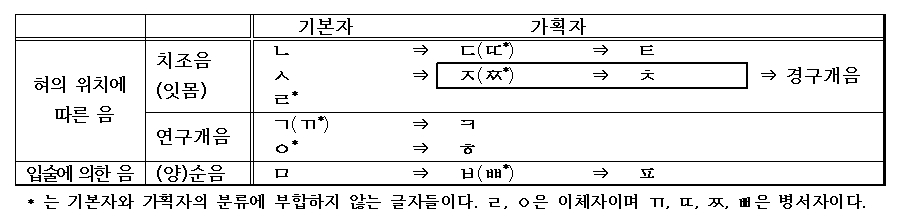 ‘ㄱ은 혀뿌리가 목구멍을 막는 현상을 본뜬 것이요. 혓소리 ㄴ은 입의 형상을 위 잇몸에 닿는 형상을 본뜬 것이요. 입술소리 ㅁ은 입의 형상을 본뜬 것이요. 잇소리 ㅅ은 이의 형상을 본뜬 것이요. 목구멍소리 ㅇ은 목구멍의 형상을 본뜬 것이다. ㅋ은 ㄱ보다 소리가 좀 거세게 나는고로 획을 더한 것이니 ㄴ에서 ㄷ, ㄷ에서 ㅌ, ㅁ에서 ㅂ, ㅂ에서 ㅍ, ㅅ에서 ㅈ, ㅈ에서 ㅊ, ㅇ에서 ㆆ, ㆆ에서 그 소리에 따라 획을 더한 뜻은 다 같다. 그러나 오직 ㅇ 만은 다르게 하고 반혀소리 ㄹ와 반잇소리 △도 역시 혀와 이의 모양을 본떴으나 그 모양을 다르게 하였을 뿐 획을 더한 뜻은 없다.’